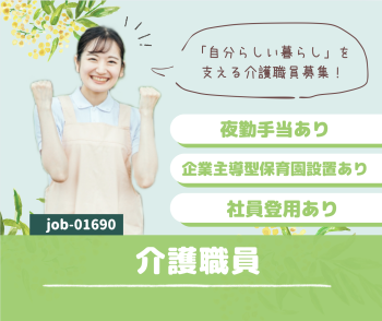 | 待遇 | ■雇用保険、労災保険、健康保険、厚生年金 ■退職金制度あり(勤続年数3年以上) ★昇給あり (前年度実績) ★賞与年2回 計2.8ヶ月分(前年度実績) |
