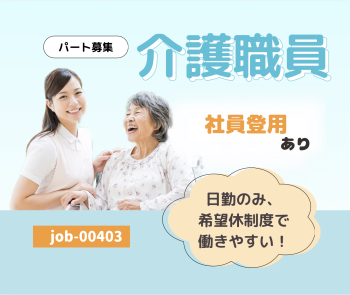 | 求める人材 | ・64歳以下(定年65歳のため) ・介護業務経験者歓迎(通所リハビリテーション、通所介護あれば尚可) 【資格】 ホームヘルパー1、2級 普通自動車運転免許 あれば尚可(AT限定可) |
