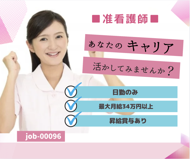 | 求める人材 | 【年齢】〜59歳以下(定年年齢を上限とするため) 【資格】 准看護師 普通自動車運転免許 ★福祉施設経験者歓迎 ★エクセル・ワードのパソコン入力ができる方 |