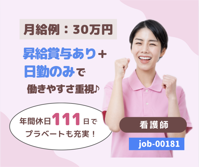 | 求める人材 | 【年齢】64歳以下(定年年齢を上限とするため) 【資格】 看護師、准看護師 ※いずれかの資格所持で可 普通自動車運転免許 ※あれば尚可 |