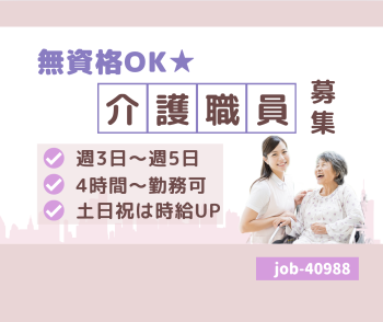 | 求める人材 | 【資格】 ・介護職員初任者研修 ・介護職員実務者研修 ・介護福祉士 |