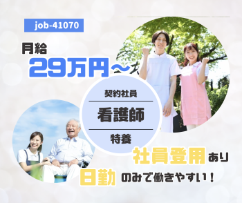 | 待遇 | ■雇用保険 ■健康保険 ■労災保険 ■厚生年金 ■退職金制度あり(勤続年数1年以上) ■マイカー通勤可 ☆小さいお子様がいらっしゃる方は、隣接病院内の託児施設を利用可能です! ★昇給あり ★賞与年3回計3.3ヶ月分 |