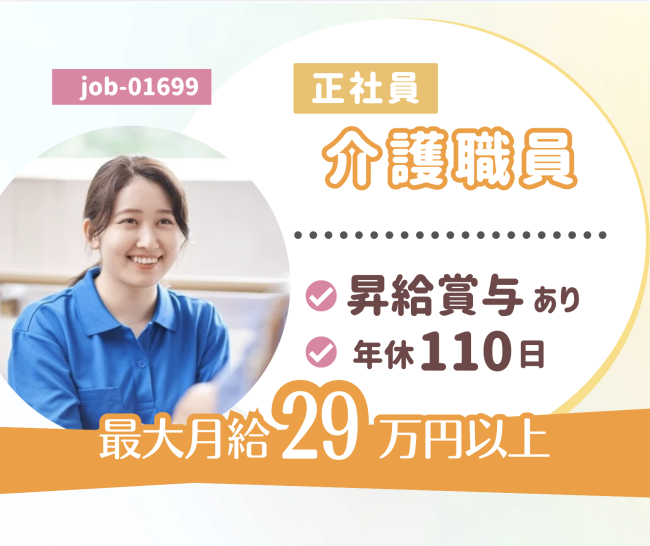 | 仕事内容 | 介護付き有料老人ホームでの介護業務全般を行います。 *入浴介助 *食事介助 *排せつ介助などの介護業務全般 ※利用定員50名 スタッフ人員27名 詳しい業務内容を知りたい方は、お気軽に見学にお越しください。 【施設見学歓迎】※見学面接同日も可 |