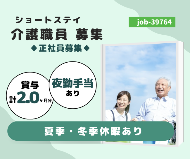 | 求める人材 | 【年齢】64歳以下(定年が65歳のため) 【資格】 介護職員初任者研修修了者(旧ヘルパー2級) 介護福祉士 普通自動車運転免許(AT限定可) |