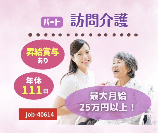 月給25万円も可能!賞与あり! 日勤のみ&年間休日115日◎地域密着の訪問介護スタッフ募集