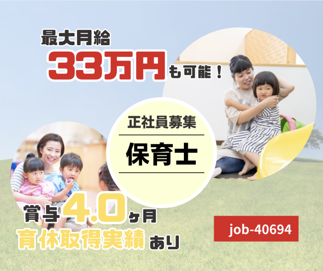 | 求める人材 | 【年齢】〜59歳(定年を上限とするため) 【資格】 保育士 普通自動車運転免許 あれば尚可 |