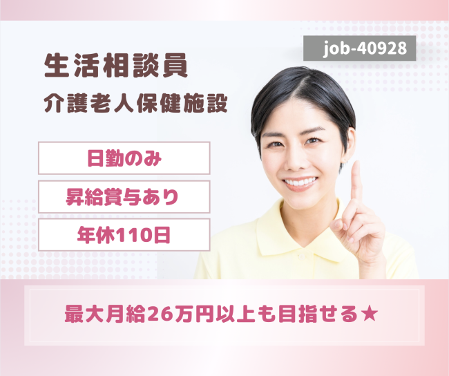 | 求める人材 | 【年齢】〜64歳以下(定年を上限とするため) 【資格】 社会福祉士 ※必須(又は社会福祉主事(任用)のいずれか) 普通自動車運転免許 ※必須 相談員業務経験がある方大歓迎★ |