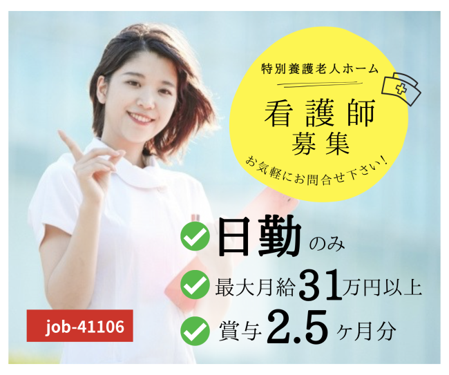 | 求める人材 | 【年齢】〜64歳(定年を上限とするため) 【資格】 看護師、准看護師 ※いずれか必須 普通自動車運転免許 (AT限定不可) |