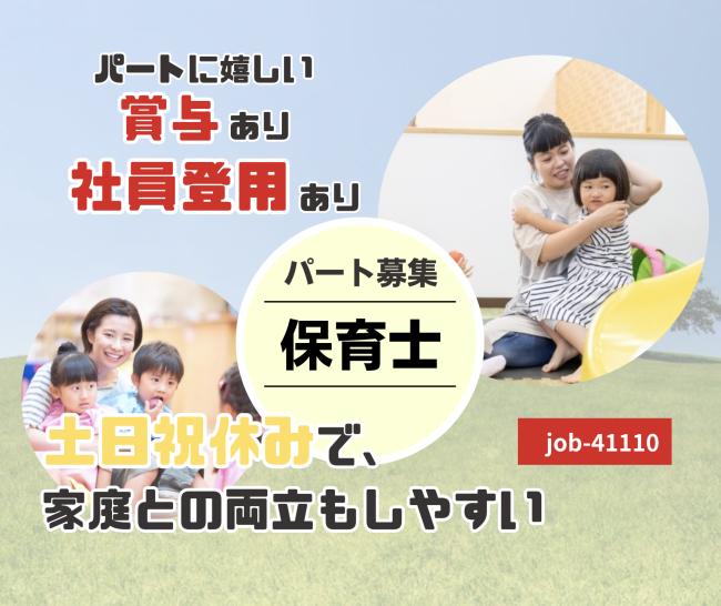 | 求める人材 | 【資格】 保育士 ※必須 幼稚園教諭免許(専修・1種・2種) ※あれば尚可 普通自動車運転免許 ※必須 |
