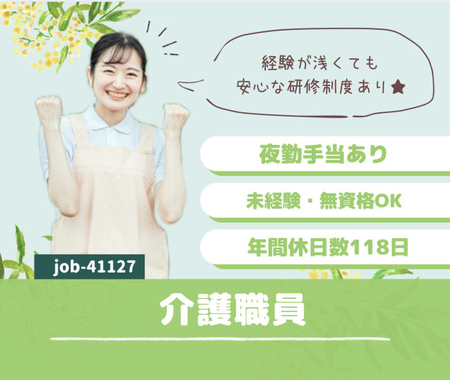| 求める人材 | 【年齢】18〜64歳(青少年の深夜業務の禁止、定年年齢を上限) 【資格】※あれば尚可 ・介護職員初任者研修修了者(旧ホームヘルパー2級) ・介護福祉士 ・介護実務経験半年以上 ★未経験、無資格の方もご相談ください! ★PCの簡単なデータ入力(Word・Excel)ができる方 ・ユニットケア経験者についても優遇 ・ユニットリーダー研修受講修了者、優遇 ・介護関係の資格保有の方は、給与算定時に優遇 |