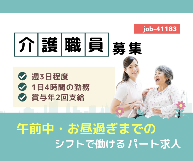 【賞与】年2回支給【時間】1日4時間勤務【日数】週3日程度【時給】休日の勤務は手当支給