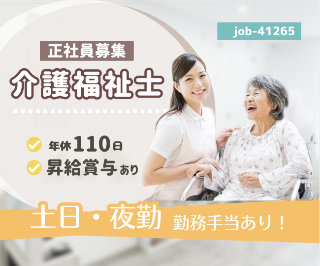 | 求める人材 | 【年齢】〜64歳以下(定年を上限とするため) 【資格】 介護福祉士 ※必須 普通自動車運転免許(AT限定可) ※必須 ★介護業務の経験がある方 |