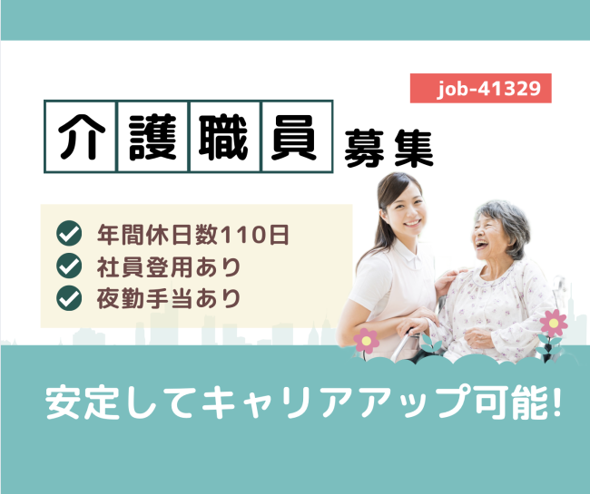 | 仕事内容 | 業務内容・・食事、入浴、排泄介助など介護業務全般 利用者様の送迎業務(軽AT車使用) 詳しい業務内容を知りたい方は、お気軽に見学にお越しください。 【施設見学歓迎】※見学面接同日も可 採用後、業務内容の変更予定範囲:会社の定める職種 |